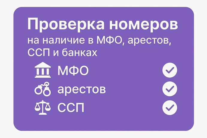 Если кратко: проверка номеров на наличие в МФО, арестов, ССП и банках — это инструмент для оценки надёжности клиентов и выявления рисков до заключения сделки.